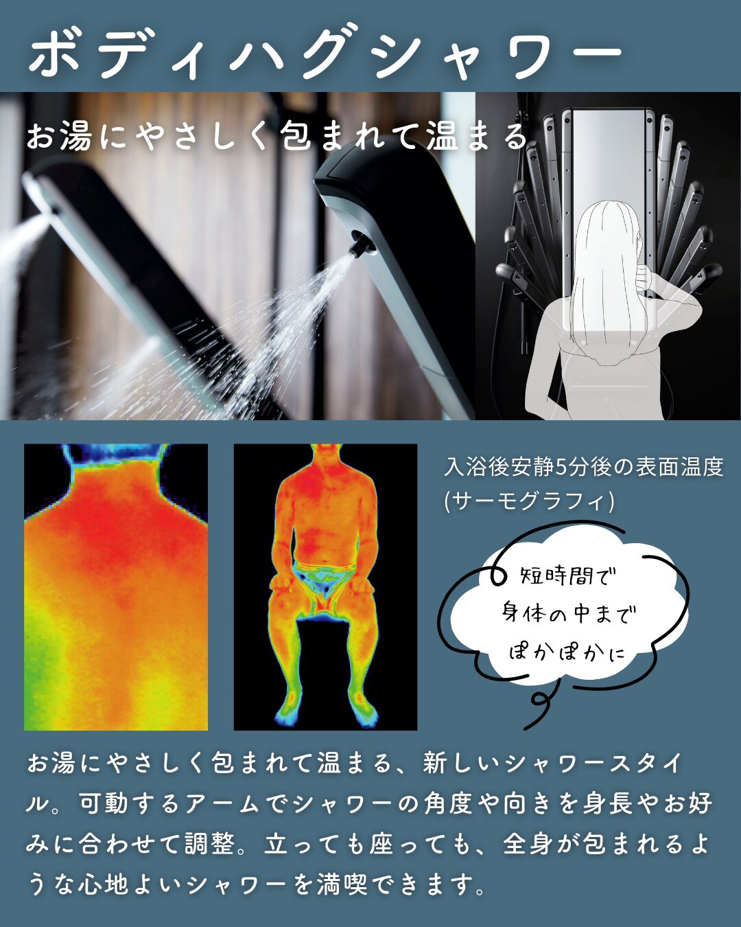 心地よい吐水が身体を包み、全身を温めます。