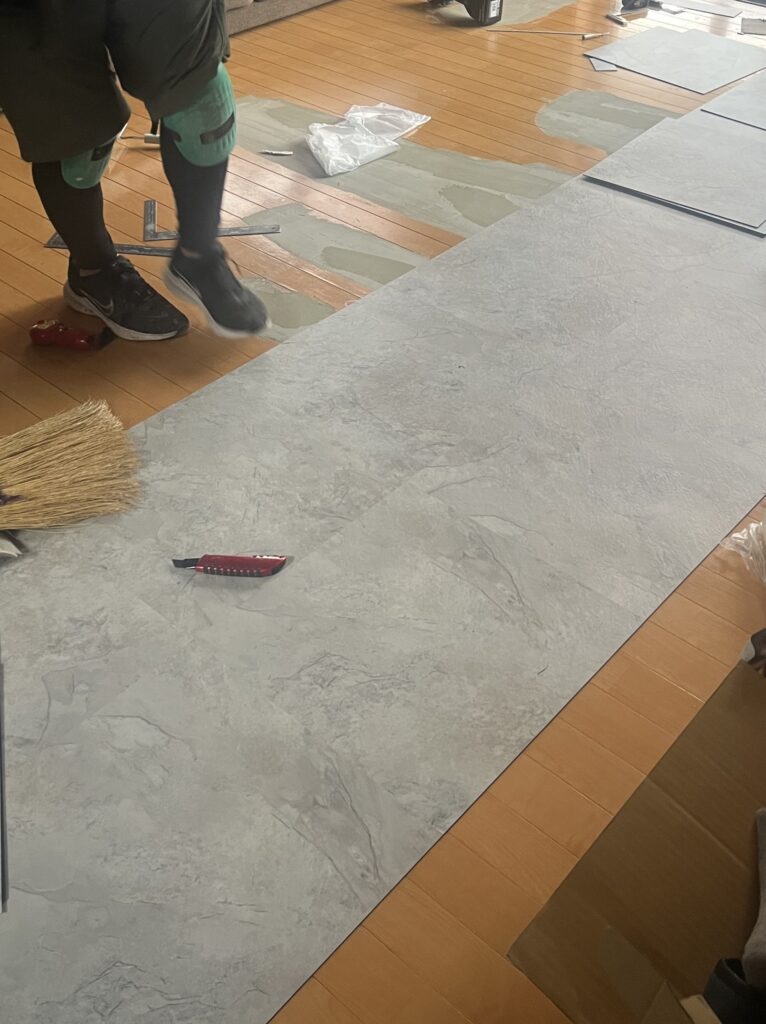 床の傷みを解消するだけでなく、お部屋全体の雰囲気をガラリと変えたいというご要望。憧れだった高級感のあるストーン調の質感を、ウスイータの豊富なラインナップからお選びいただき、理想以上の空間を実現されました。